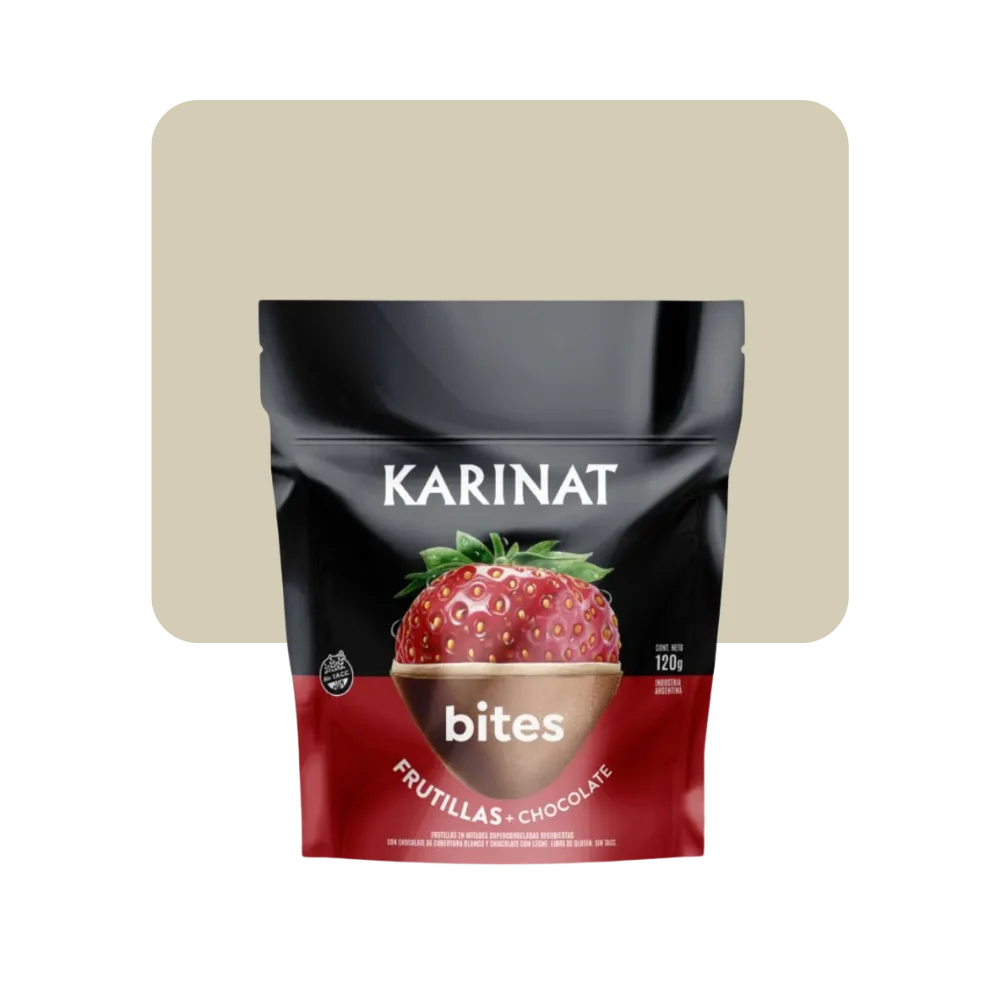 Ingredientes: Frutillas en mitades super congeladas, baño de repostería fantasía blanco con aromatizante artificial sabor vainilla (INS 322, INS 476, aromatizante permitido), baño de repostería con leche para heladería (INS 322, INS 476, aromatizantes permitidos).