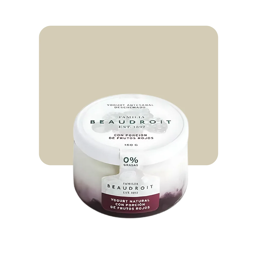 Ingredientes: yogurt (87,5 %): leche entera, leche en polvo descremada, azúcar, fermentos lácticos, pectina crítica, preparado de frutas (azúcar, arándanos, moras, frambuesas, sauco, almidón modificado, goma xáctica, ácido cítrico). Contiene leche.