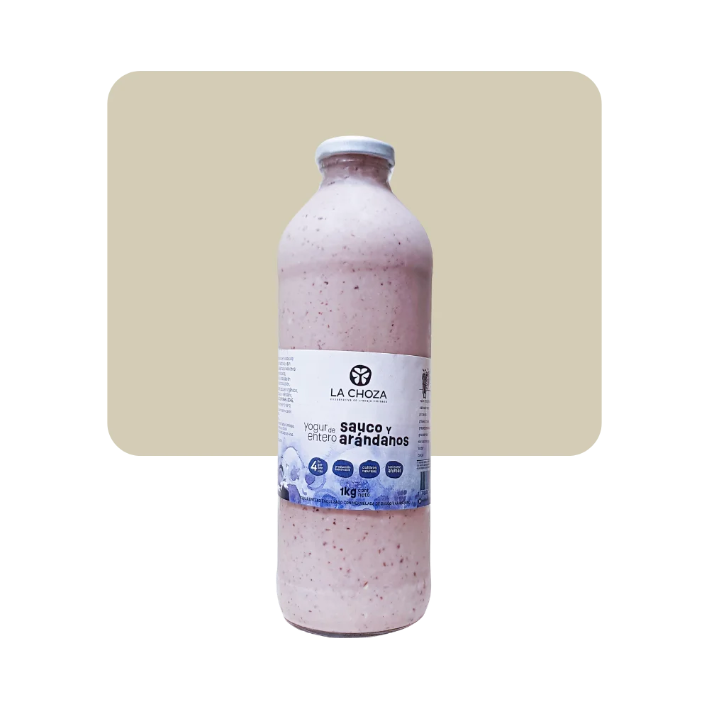 Yogur entero a base de cultivos naturales, bienestar animal, con sauco y arándanos.