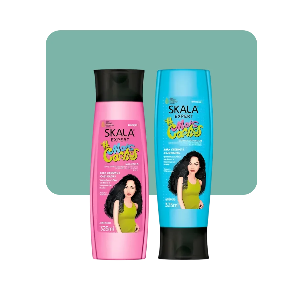 El kit Skala Mais Cachos es ideal para cabellos rizados, ondulados y con rulos. Posee ingredientes que hidratan y desenredan.