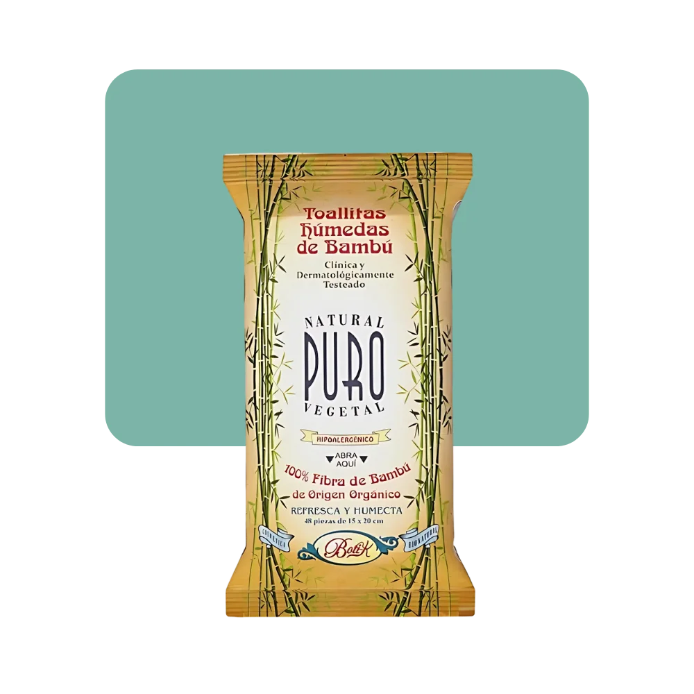 Las Toallitas Húmedas Boti-K Puro están fabricadas en un delicado y suave paño no textil, biodegradable, de Bambú Orgánico. De aroma sutil y herbáceo. No flushable (no arrojar al inodoro).Hipoalergénicas, dermatológicamente testeadas. Limpian y humectan, con efecto calmante, hidratante y nutritivo. Ideal para la higiene personal, limpiar el rostro o cuerpo, refrescar la piel. La dejan suave, revitalizada y luminosa.Contienen jugo de aloe vera, rico en aminoácidos, vitaminas A,C y E, minerales y enzimas. Con propiedades calmantes e hidratantes. A las propiedades del aloe, se suman las de los aceites de jojoba y coco, que ayudan a retirar la suciedad en forma delicada, humectando y nutriendo la piel. Los extractos botánicos de manzanilla y centáurea (ricos en flavonides, polisacáridos y cumarinas, entre otros) ayudan a calmar la irritación cutánea, descongestionar, refrescar, hidratar, humectar y suavizar la piel. Contribuyen también a reducir los poros y desinflamar. Práctico envase reciclable que permite llevarlas donde quieras.