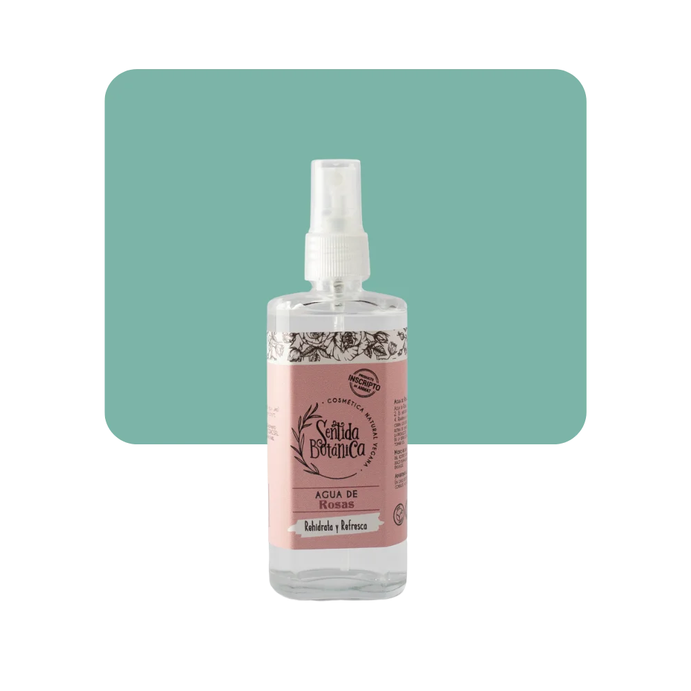 Agua de rosas pura que rehidrata y refresca, ideal para uso diario.