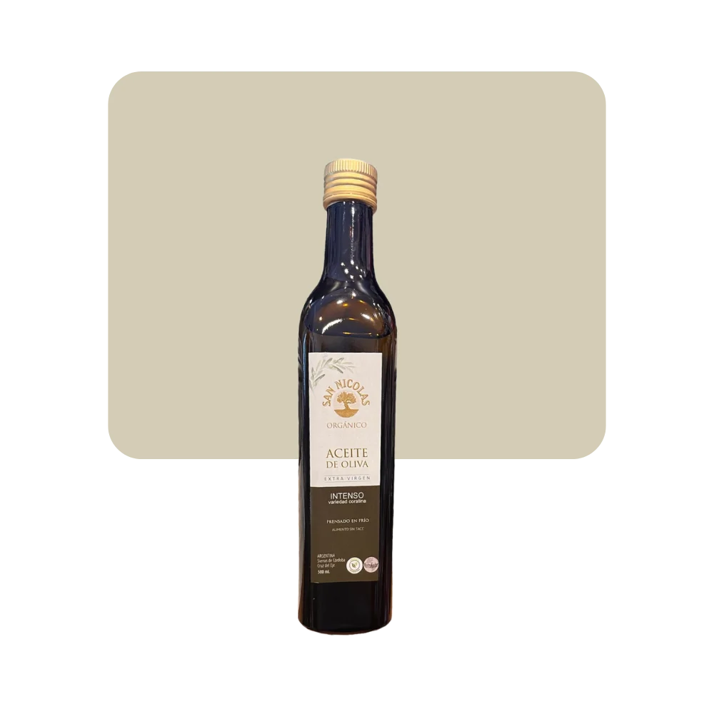 Aceite de oliva orgánico, extra virgen, en envase de vidrio. Variedad: coratina. Acidez igual o menor a 0,4 %.