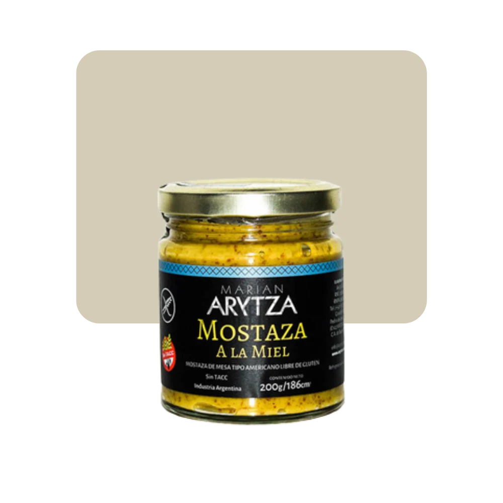 Vinagre de alcohol, agua, miel, granos de mostaza, azúcar blanco, sal, hinojo, ajo y cúrcuma.