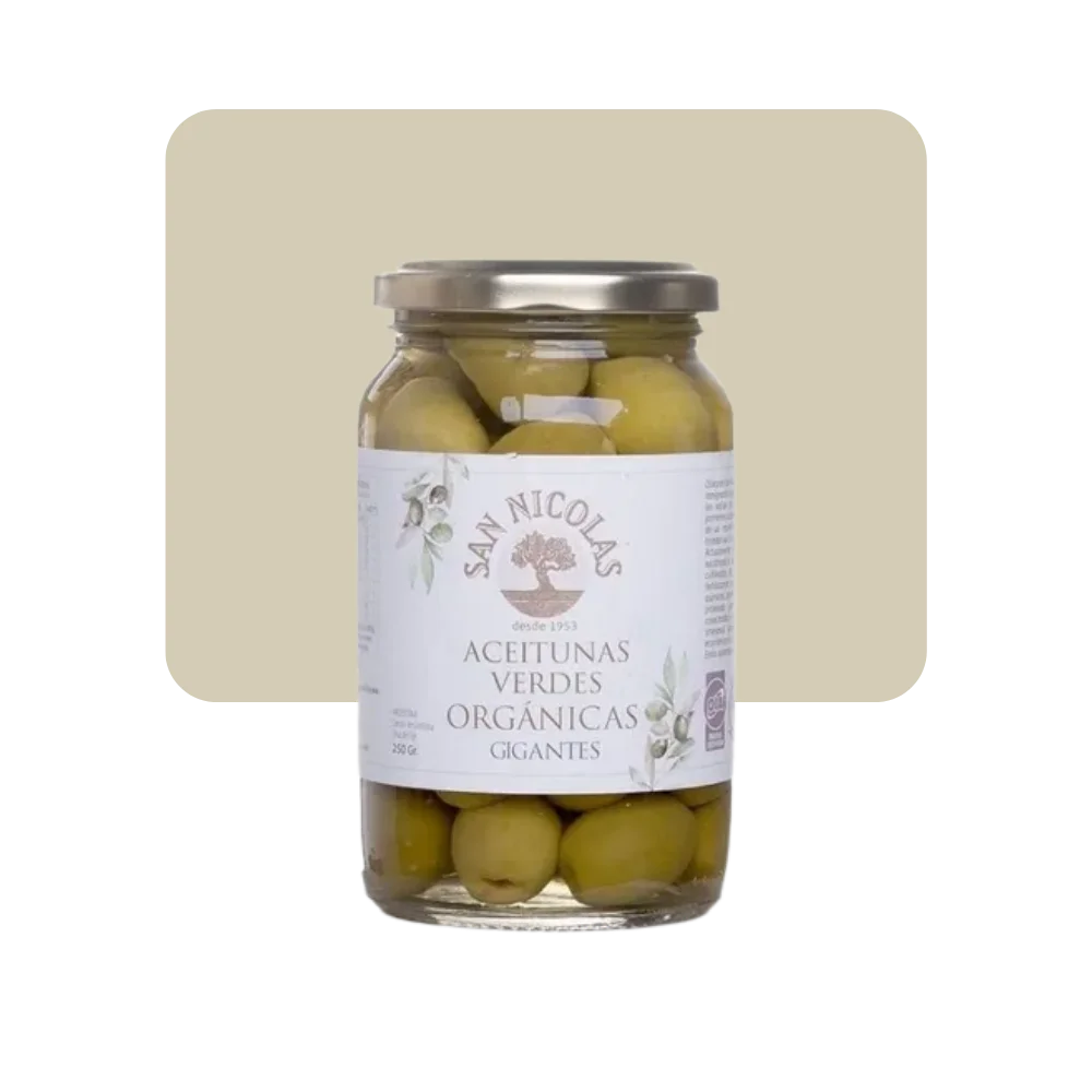 Las aceitunas verdes orgánicas son cultivadas y procesadas siguiendo prácticas agrícolas orgánicas certificadas.