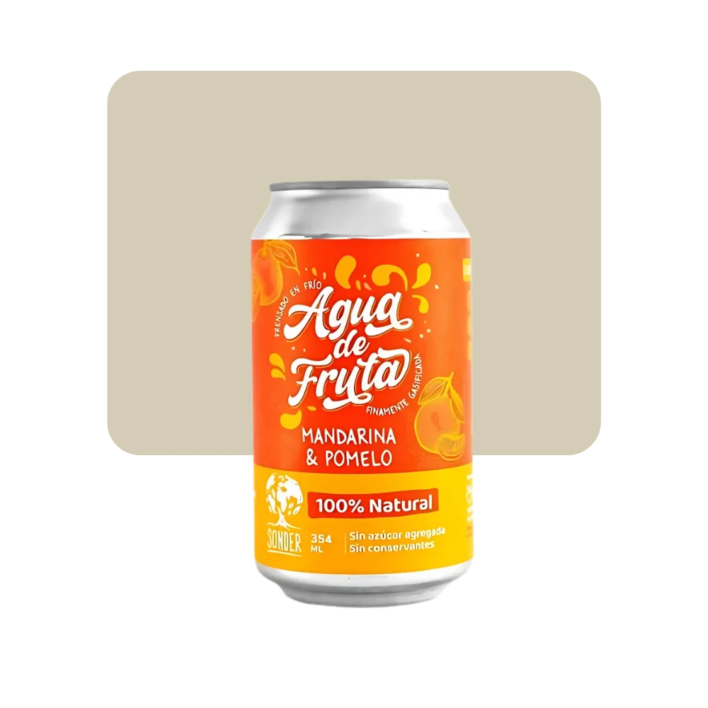 Bebida natural finamente gasificada, compuesta por un 70% de agua purificada y un 30% de jugo de mandarina y pomelo prensado en frío.