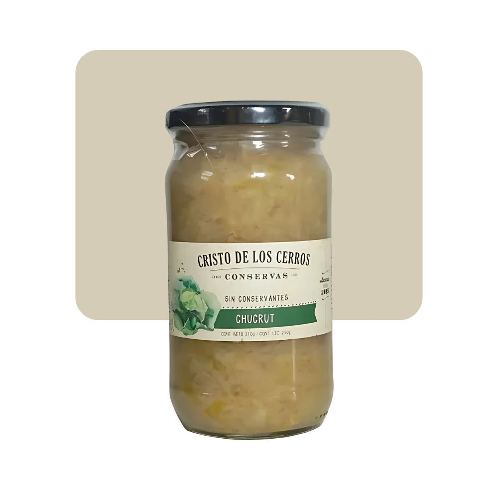 Cristo de los Cerros elabora conservas y encurtidos desde 1985. El chucrut se utiliza principalmente como guarnición, aunque también podemos incorporarlo como un entrante tibio o como parte de un plato combinado. Es típico de la comida alemana, por lo que queda muy bien con carnes, como salchichas, chuletas de cerdo y panceta. También lo podés comer con proteínas vegetales, como tofu, o ensaladas (puede ser de remolacha, queso, salmón y chucrut)