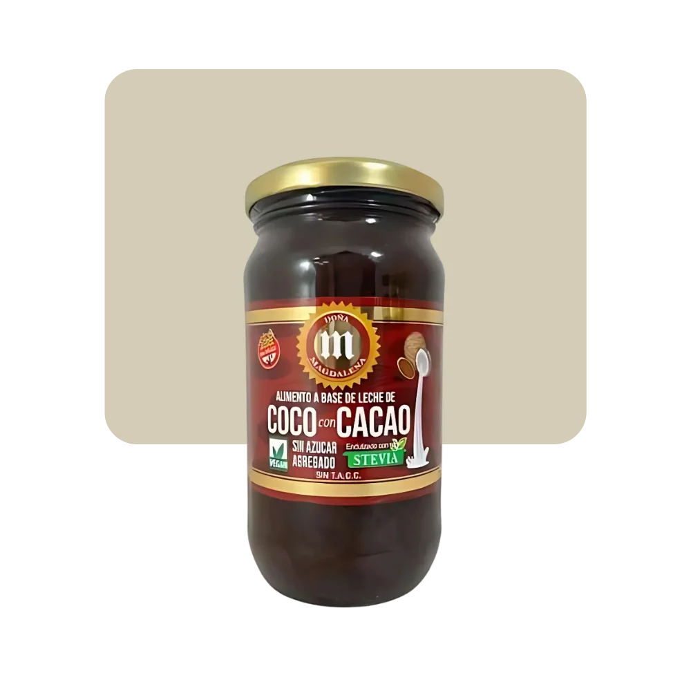 Alimento a base de leche de coco y cacao vegano sin azúcar, coco y cacao, sin proteína láctea. APLV.