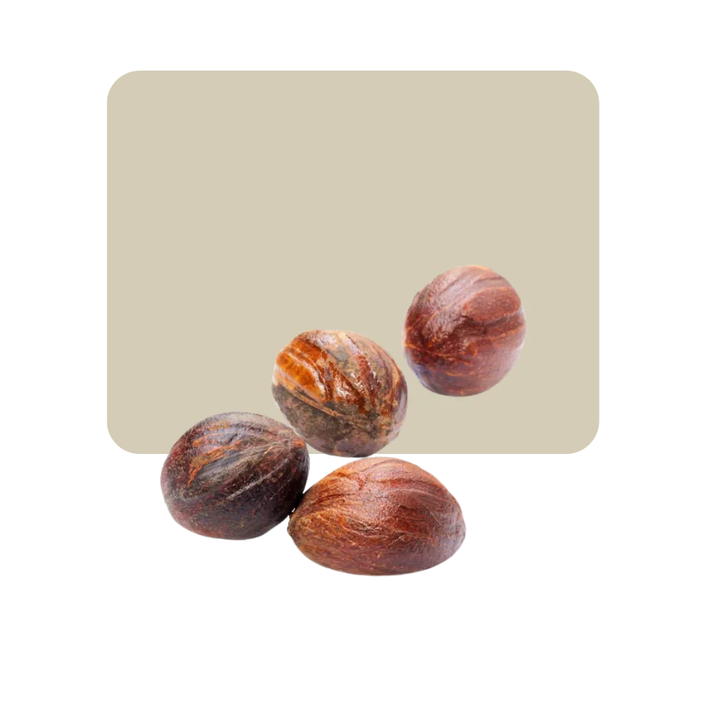La nuez moscada entera es una especia aromática que se obtiene del árbol Myristica fragrans. Se caracteriza por su forma ovalada y dura, con un exterior rugoso y de color marrón. Su sabor es cálido, ligeramente dulce y terroso, con notas aromáticas distintivas. Se utiliza rallada o molida para sazonar una variedad de platos, como sopas, guisos, salsas, postres y bebidas calientes.