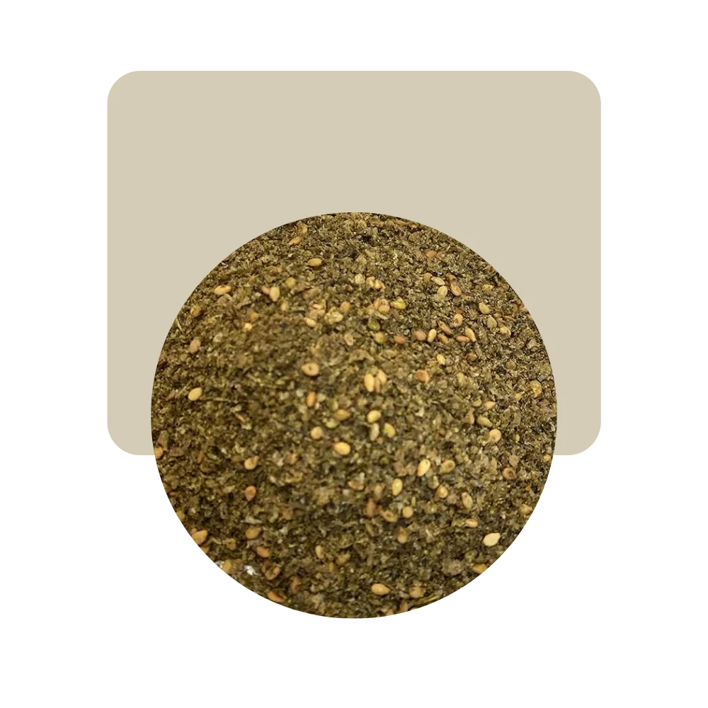 Mezcla de especias de Oriente Medio, que combina sésamo tostado, sumac, tomillo y otras hierbas.