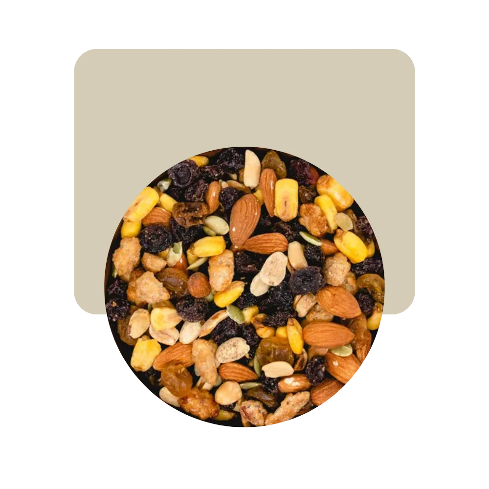 Agradable mezcla agridulce entre el maíz salado y las garrapiñadas de maní dulces, sumado al gran aporte vitamínico y mineral de las semillas de zapallo y pasas. Mix de textura crocante.