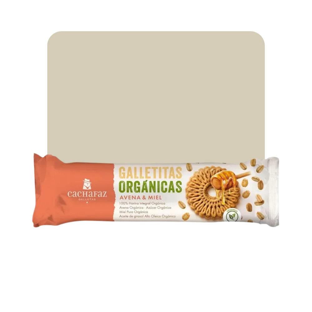 Ingredientes: Harina integral (orgánica), azúcar (orgánica), aceite de girasol alto oleico prensado en frío (orgánico), avena arrollada (orgánica), harina de avena (orgánica), miel de abeja (orgánica), sal marina, RAI: INS (500ii y 503ii), AROMATIZANTE / SABORIZANTE vainilla natural, antioxidante natural (tocoferoles). CONTIENE: DERIVADOS DE TRIGO Y AVENA. PUEDE CONTENER: TRAZAS DE LECHE, HUEVO, SOJA, MANI Y ALMENDRAS.