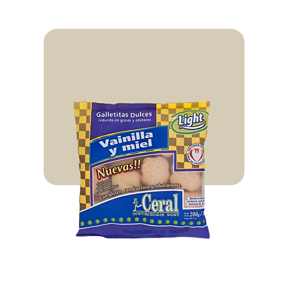 Ingredientes: Harina con gluten de trigo enriquecida (adicionada con hierro 30 mg/kg, Ácido fólico 2,2 mg/kg, tiamina (b1): 6,3 mg/kg, riboflavina (b2): 1,3 mg/kg, niacina: 13 mg/kg), prebiótico: polydextrosa, lecitina de soja, aceite vegetal alto oleico, leudantes químicos: bicarbonato de sodio y bicarbonato de amonio, edulcorante nutritivo: sorbitol, edulcorante no nutritivo natural: steviósido (stevia rebaudiana) y saborizante sabor vainilla.