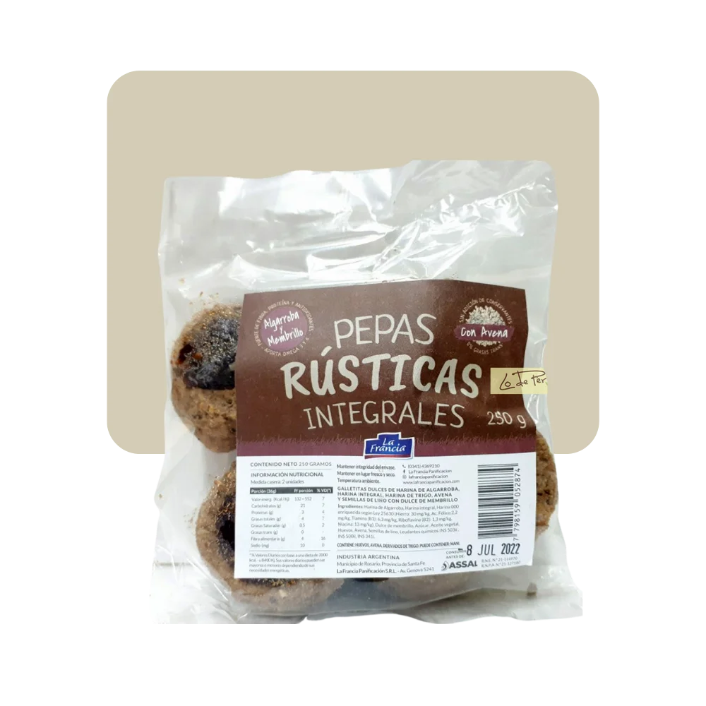 Estas pepas integrales estan elaboradas con harina integral, harina de algarroba y dulce de membrillo. De base tiene una masa que contiene semillas de chía, lo que le da un sabor diferente.