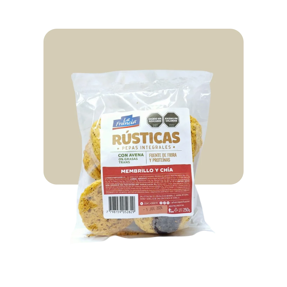 Ingredientes: Harina integral, dulce de membrillo, harina de trigo enriquecida según ley 25630 (hierro, ácido fólico, tiamina, riboflavina niacina), azúcar, aceite de girasol alto oleico, huevos, avena, semillas de chía, esencia de vainilla, bicarbonato de amonio INS 503ii, polvo para hornear (bicarbonato de sodio INS 500ii y fosfato monocálcico INS 341i). Colorante amarillo ocaso (INS 110).