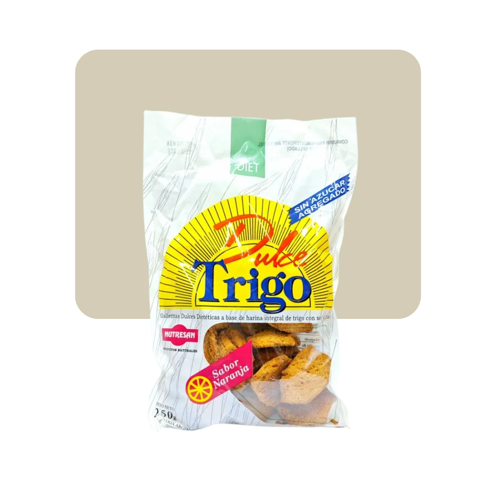 Ingredientes: Harina integral de trigo, gluten, polidextrosa, aceite de girasol, sólido de leche, esencia natural de naranja, edulcorante no nutritivo: sacarina 20mg/100g, neohesperidina DC 25mg/100g. Sin colorantes. Sin sal.
