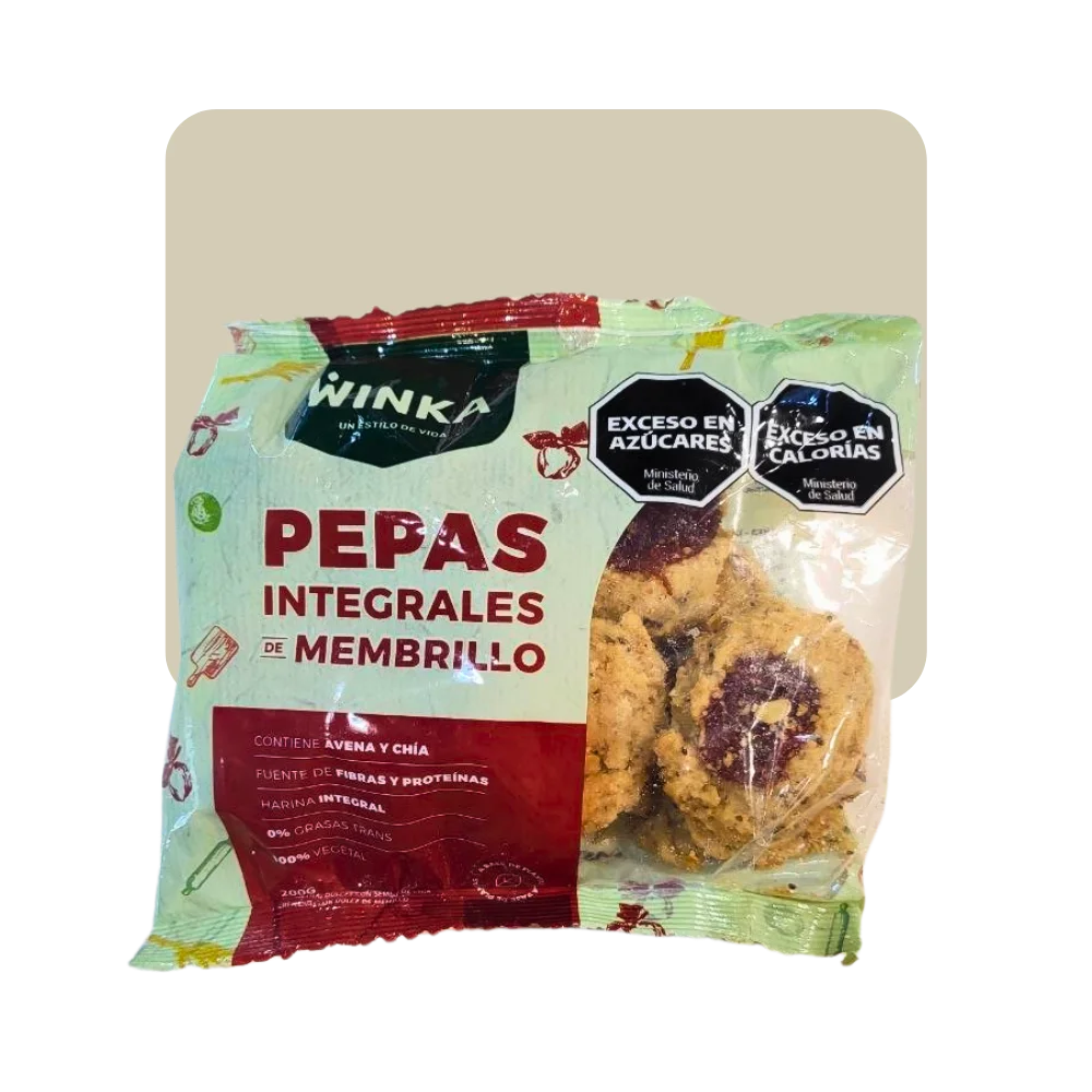 Las Pepas Integrales de Membrillo Winka combinan una masa elaborada con harina integral y un clásico relleno de membrillo, logrando una textura suave con un centro dulce y frutal.