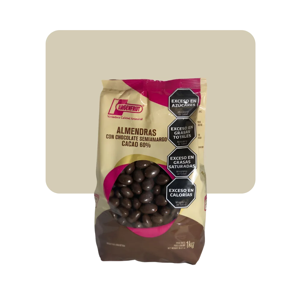 Ingredientes: Chocolate de cobertura semiamargo (azúcar, masa de cacao, manteca de cacao, EMU: lecitina de soja, poliglicerol, policirrineolato, ARO:vainillina, etilvainillina), almendras tostadas, azúcar, cacao en polvo, maltodextrina, ANAH: INS 553 iii, Vitamina E, GLA: INS 904.