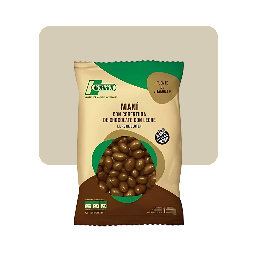 Ingredientes: Maní tostado, cobertura de chocolate semiamargo: (Azúcar, masa de cacao, manteca de cacao, EMU: lecitina de soja, poliglicerol, polirricinoleato, aromatizante: vainilla y etilvainillina), azúcar, maltodextrina, COL: INS 124, 102, 133, ANAH: INS:553iii, vitamina E, GLA:INS: 904. Contiene maní, tartrazina y derivados de soja. Puede contener leche, almendras y avellanas.