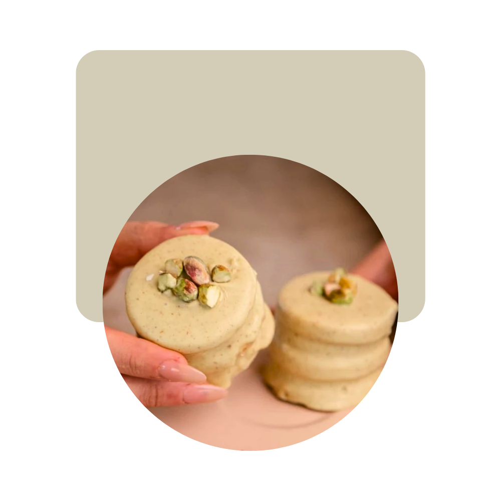 Ingredientes: Harina de almendras, harina de coco, choco blanco sin azúcar, pasta de pistachos, huevos, queso crema y stevia.