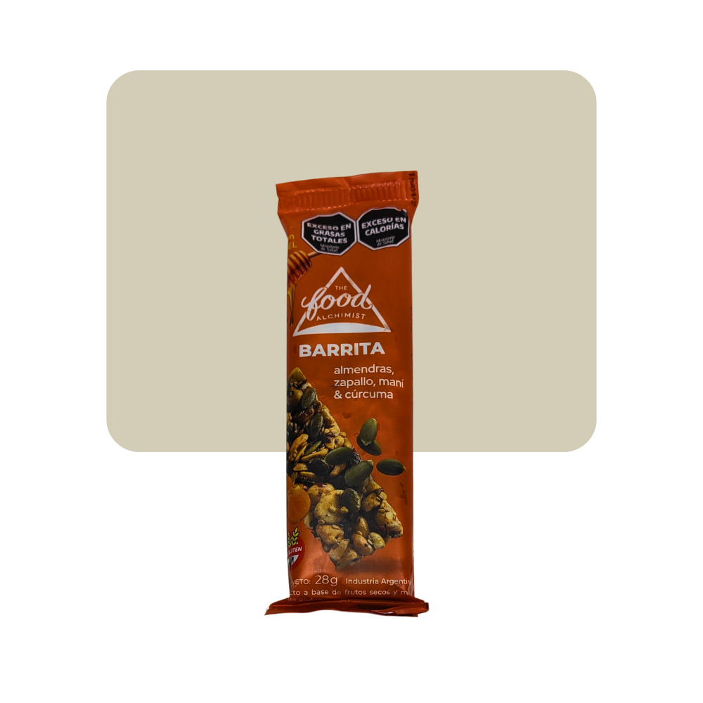 Barra saludable con almendras, semillas de zapallo, maní y cúrcuma, endulzada naturalmente con miel. sabor especiado y textura crocante. Libre de gluten.