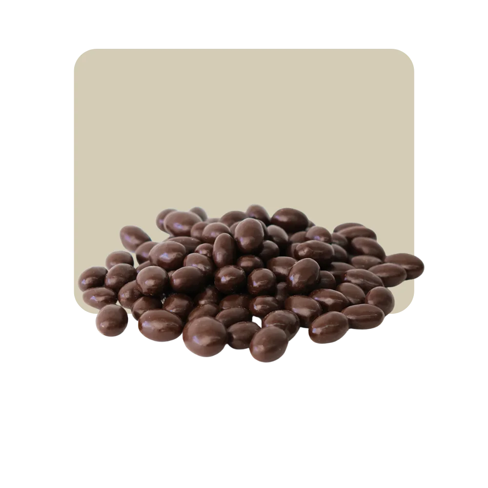 Almendras tostadas bañadas con chocolate semiamargo 60%. Sin TACC, apto para celíacos.
