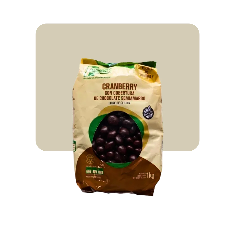 Ingredientes: Cobertura de Chocolate Semiamargo (Azúcar, Licor de Cacao Manteca de Cacao, Lecitina de Soja (INS 322), Aromatizante: Esencia artificial de Vainilla) Arándano, Estabilizante: Goma Arábiga (INS 414), Esencia de Frambuesa. Contiene: Derivados de Soja. Puede contener: gluten, maní y Otros frutos secos.