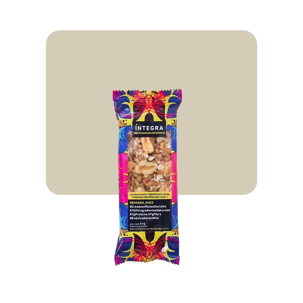 Ingredientes: Avena, proteína vegetal texturizada, fibra de la raíz de achicoria (inulina), maní, almíbar de azúcar mascabo, banana deshidratada, aroma a banana.CONTIENE AVENA, MANÍ, SOJA. PUEDE CONTENER TRIGO, CEBADA, CENTENO, ALMENDRAS, CASTAÑAS DE CAJÚ, NUEZ, AVELLANAS Y DERIVADOS DE LECHE.