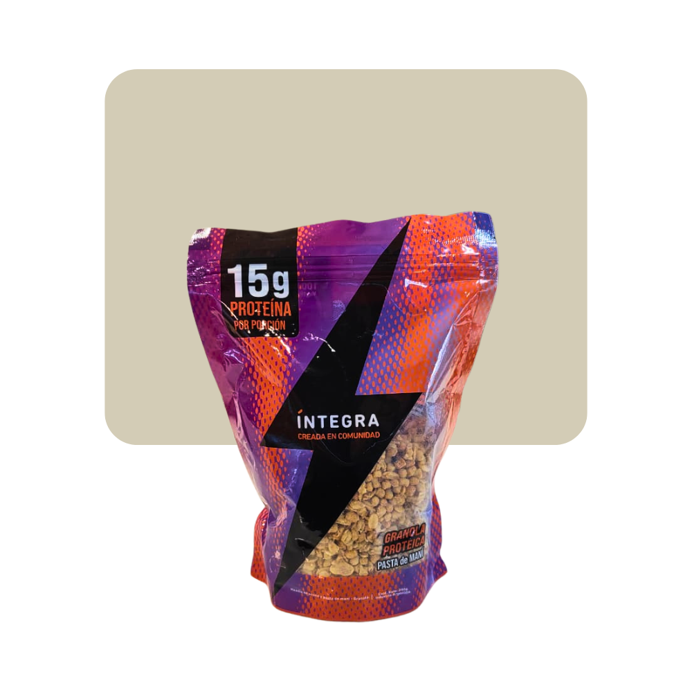 La Granola Proteica Integra con Pasta de Maní combina avena integral, frutos secos, semillas y pasta de maní de alta calidad, generando un mix crocante y lleno de sabor.