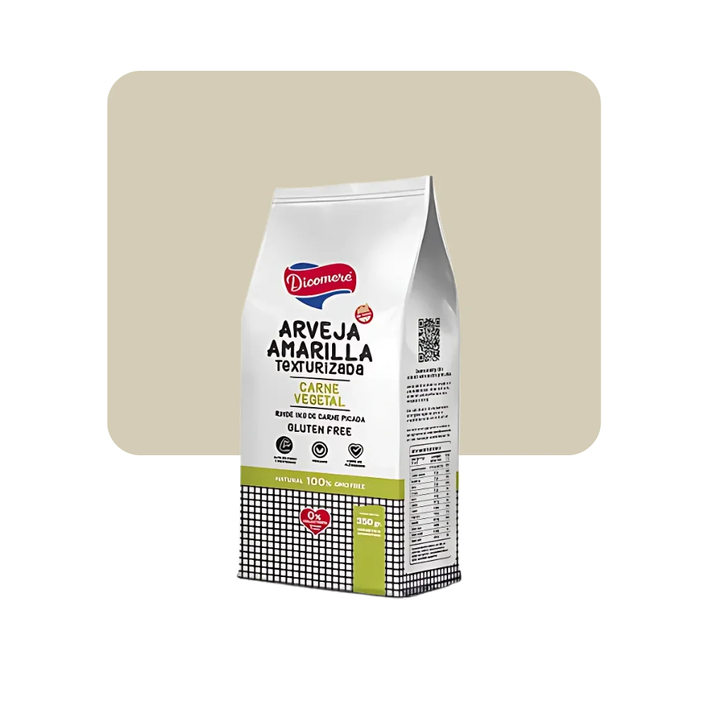 Esta arveja amarilla texturizada, también conocida como carne vegetal, se obtiene mediante un proceso de molienda, clasificación y extrusión de arvejas, una valiosa fuente de proteínas vegetales. Elaborada exclusivamente con arvejas NO GMO y sin la adición de conservantes ni aditivos, es una alternativa natural a la carne picada.