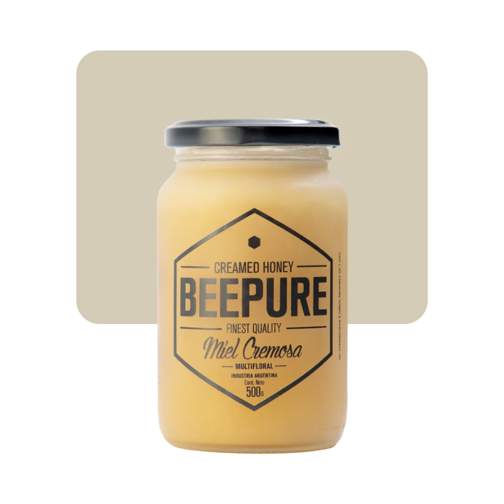 La miel BEEPURE 100% miel de abeja proviene de colmenas de Las Flores, Buenos Aires. Es multifloral: de trébol, melilotus y cardo.