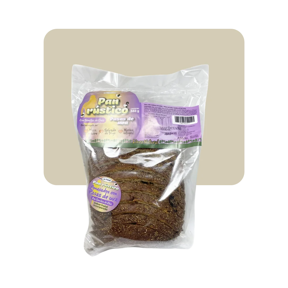 Pan de masa madre amasado con pasas de uva, salvado de trigo, harina integral y semillas de chia.