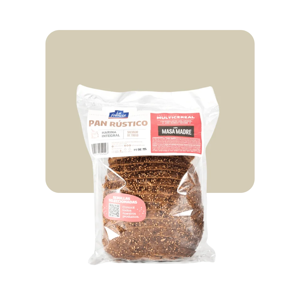 Pan a base de harina integral, salvado de trigo y semillas de lino, girasol, chía, quinoa y sésamo con masa madre. Sin azúcar agregada.