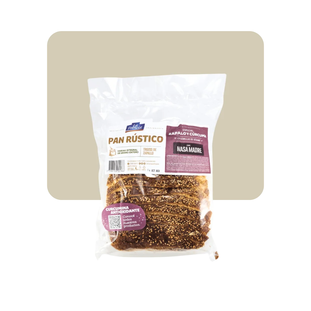 Pan rústico de zapallo y cúrcuma, elaborado a base de harina integral de grano entero y trozos de zapallo deshidratado, único en su tipo.