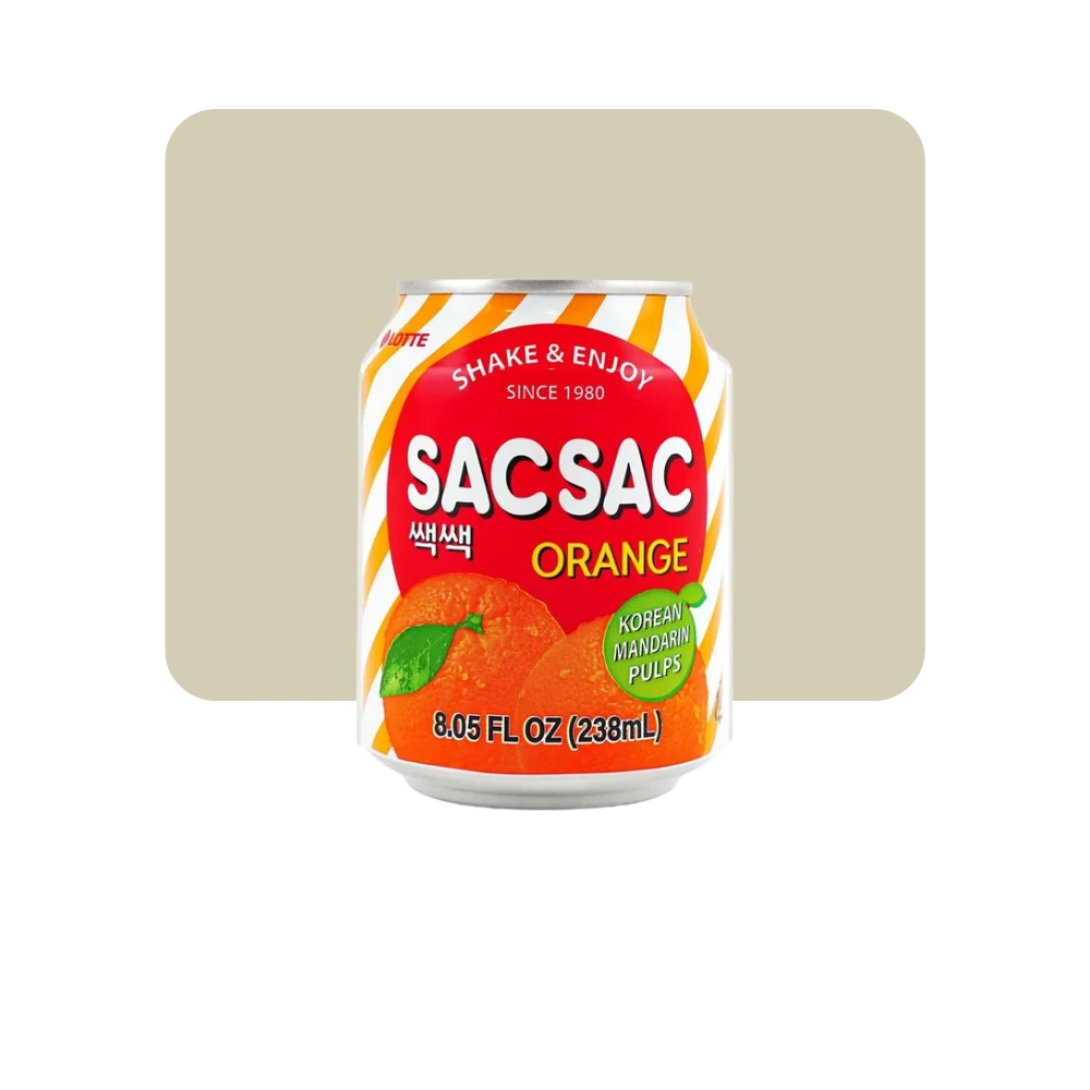 El Sac Sac Naranja de Lotte es un jugo icónico de Corea, reconocido por su textura única con pequeños trocitos de pulpa que se sienten en cada sorbo. Su sabor cítrico es suave y refrescante, perfecto para hidratarte y sumar un toque diferente a tu rutina.