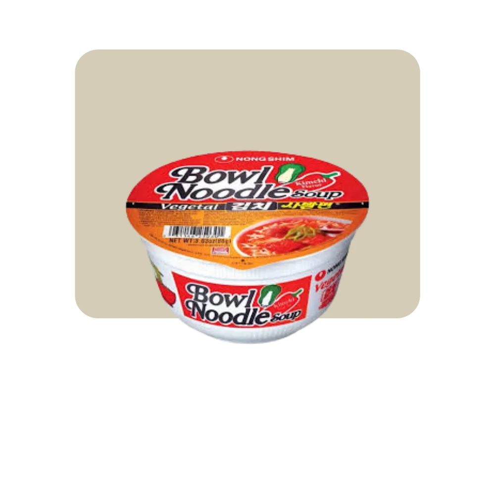 El Bowl Noodle Kimchi y Verduras de Nongshim combina fideos instantáneos con un caldo inspirado en el kimchi coreano, acompañado de vegetales deshidratados que aportan sabor y textura.