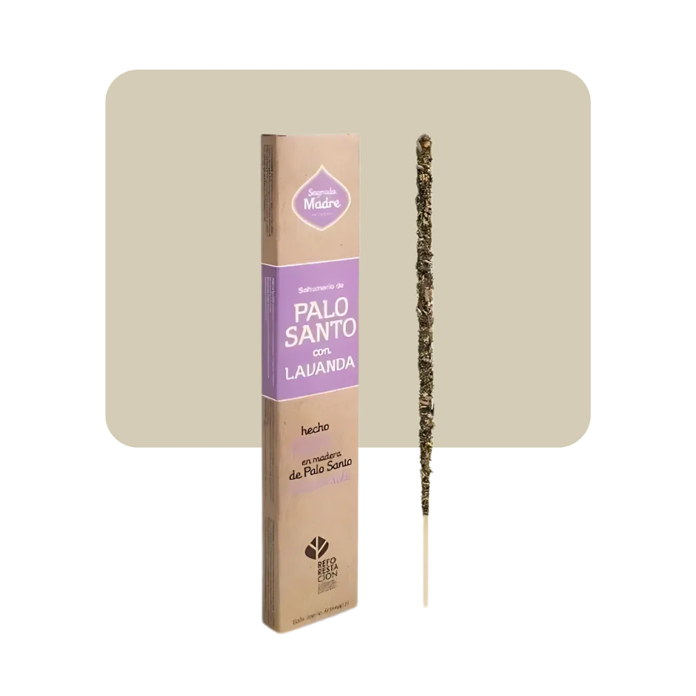 Composición: madera de Palo Santo (Perú), flores de lavanda, aceite esencial de lavanda, aglutinante natural y sal.