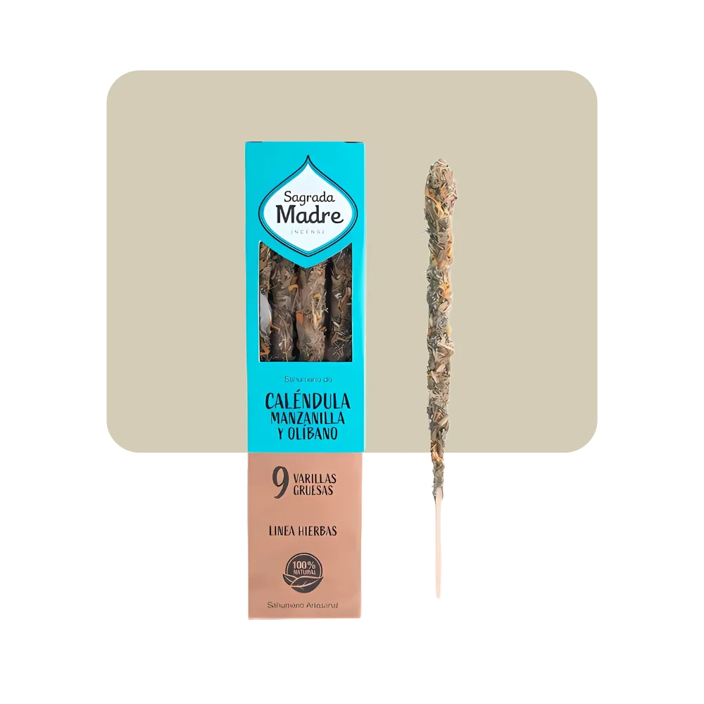 Composición: Flores de caléndula, flores de manzanilla, olíbano, aceite esencial de manzanilla y caléndula, carbón vegetal, aglutinante natural a base de plantas.