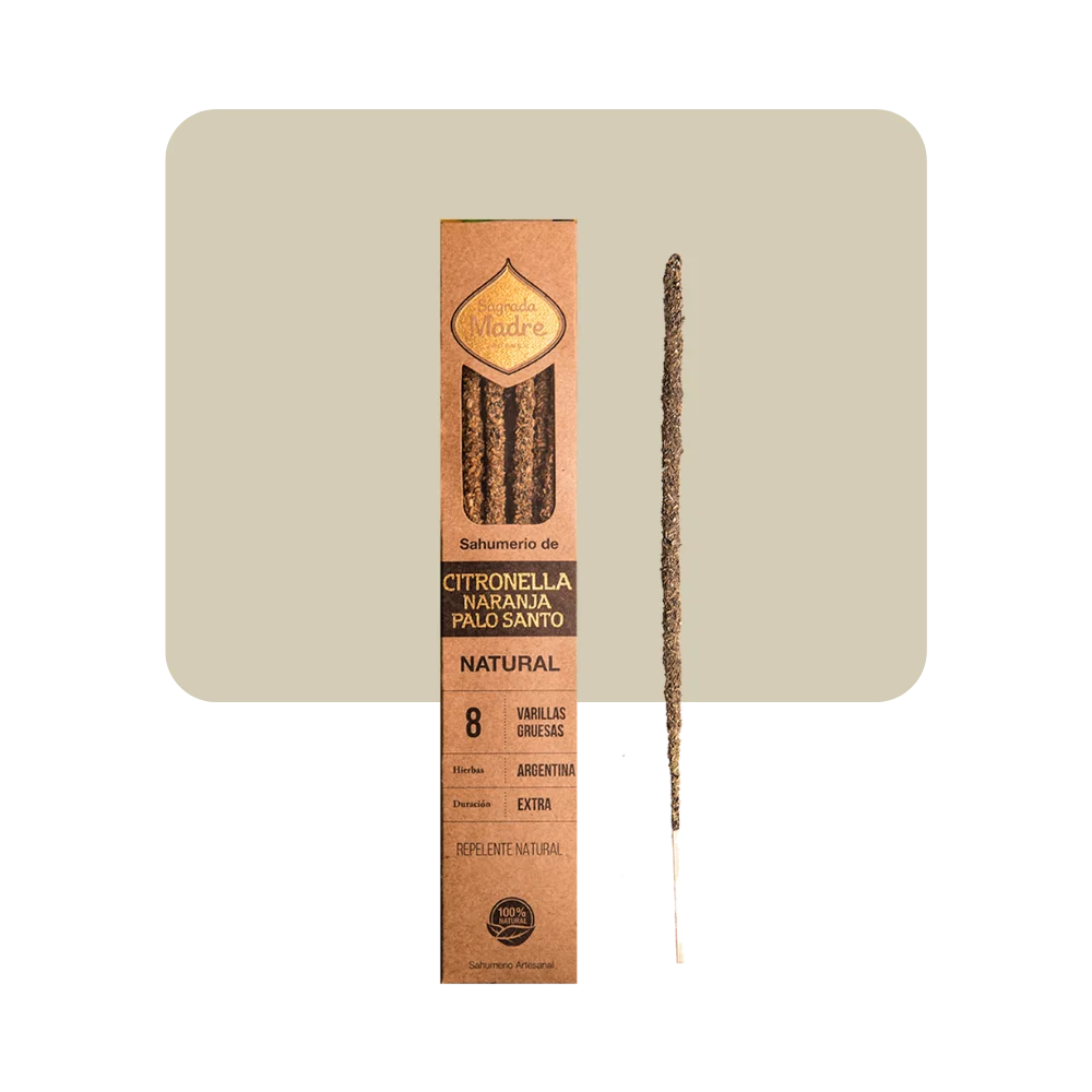 Composición: Palo santo (peruano), cáscara de naranja, aceite esencial de citronella, resina de Olíbano, carbón natural, aglutinante natural.