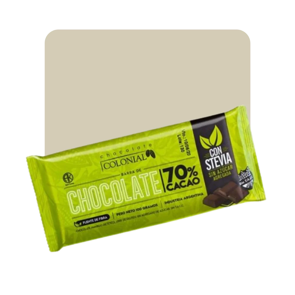 Delicioso chocolate amargo dietético con un 70 % de cacao, sin agregado de azúcar. Endulzado con Stevia. Sin TACC.