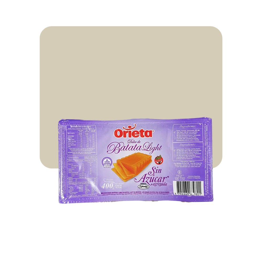 Ingredientes: batata, fructosa, gelificante: INS 406 (agar agar), INS 407 (Carragenina), INS 471 (Goma Tara), Conservador: INS 202 (Sorbato de Potasio), Edulcorante: INS 955 (Sucralosa: 10 mg/100 gr), Colorante: INS 110 (Amarillo Ocaso), Aromatizante artificial sabor vainilla.