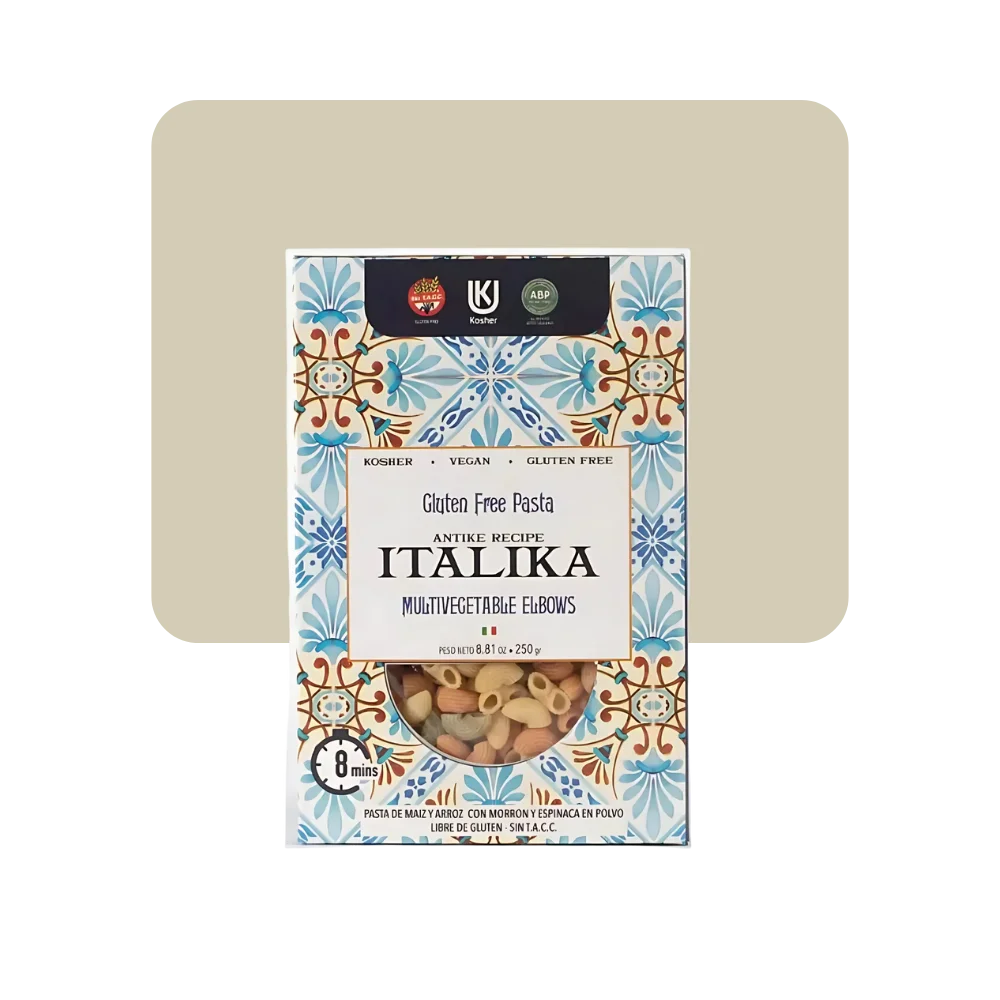 Coditos multivegetales, elaborados con harina de maíz, harina de arroz, morrón y espinaca.