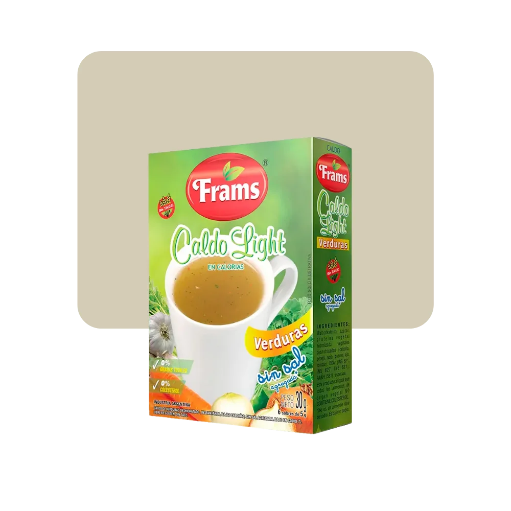 Ingredientes: Proteína vegetal hidrolizada, maltodextrina, lactosa, vegetales deshidratados (cebolla, zanahoria, perejil, apio, puerro, ajo), especias (nuez moscada, pimentón, mostaza amarilla, pimienta blanca molida), EXA (INS 631, INS 627), ANAH (INS 551).