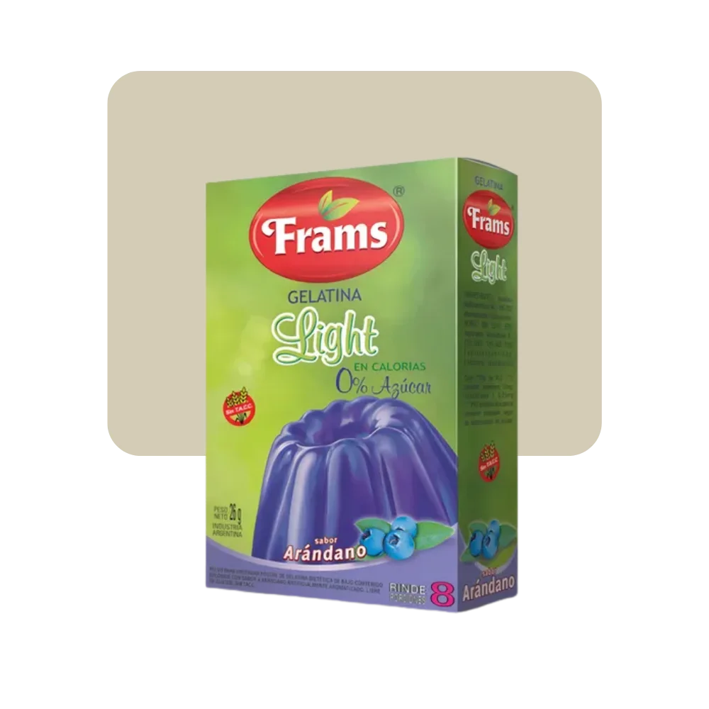 Polvo para Preparar gelatina dietética de bajo contenido calórico, con sabor a arándanos artificialmente aromatizado. Libre de Gluten.