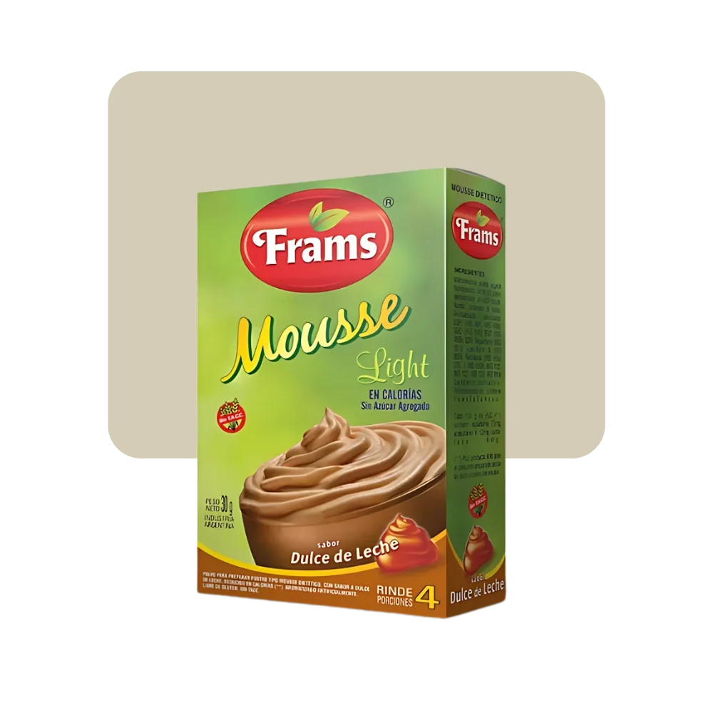 Polvo para preparar postre tipo mousse dietético con sabor a Dulce de Leche. Reducido en calorías artificialmente aromatizado. Libre de Gluten.