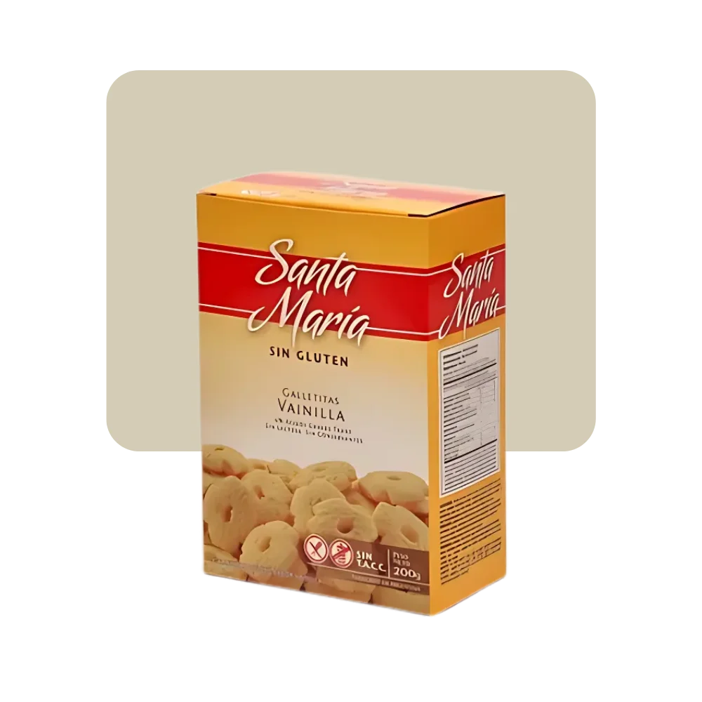 Ingredientes: Almidón de maíz, harina de arroz, azúcar, aceite vegetal, huevo, sal, agentes leudantes (bicarbonato de sodio, bicarbonato de amonio, fosfato monocalcico), estabilizantes (goma guar, goma xantica ), colorante (tartrazina), emulsionante (lecitina de soja ), saborizantes (esencia de vainilla, esencia de limon ).Contiene : huevo, soja.