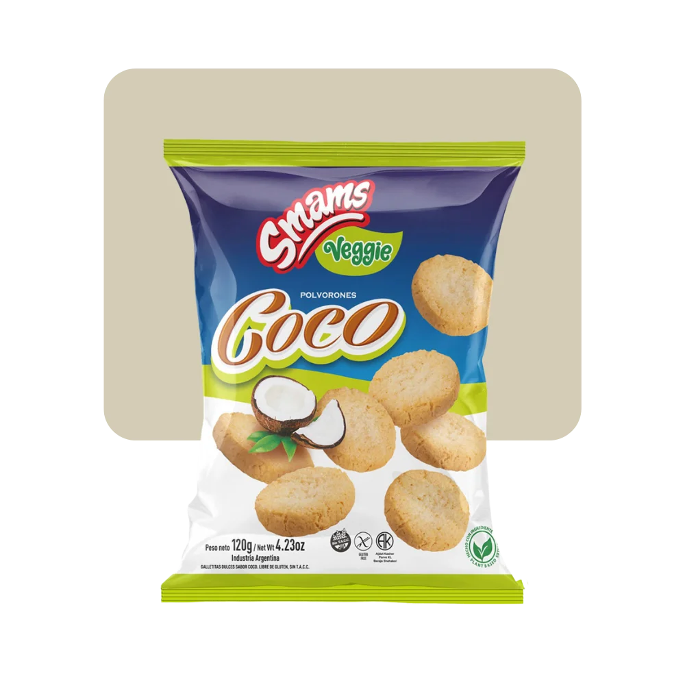 Ingredientes: Fécula de maíz, harina de arroz, azúcar, aceite girasol alto oleico, agua, glucosa, harina de soja, sal, aroma coco, colorante amarillo cúrcuma, lecitina de soja, bicarbonato de sodio, bicarbonato de amonio, propionato de calcio, sorbato de potasio.