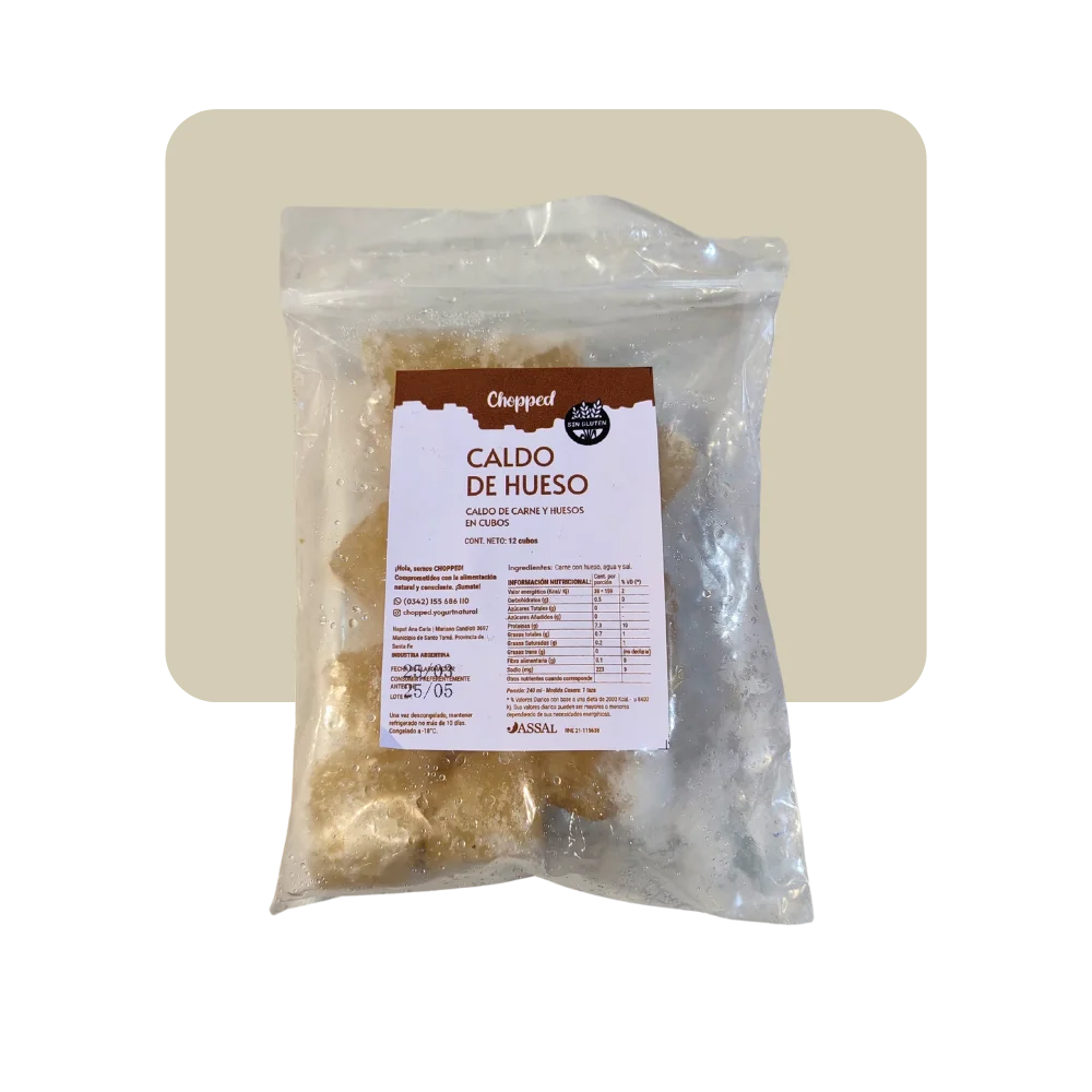 Es una preparación obtenida a partir de hervir res junto con agua. Se cocina a fuego lento durante 48hs lo que permite que los nutrientes y compuestos beneficiosos presentes en los huesos y los tejidos se liberen en el agua. Es rico en colágeno, aminoácidos y minerales. Mejora la digestión, fortalece las articulaciones, promueve una piel mas firme, también tiene propiedades antiinflamatorias.