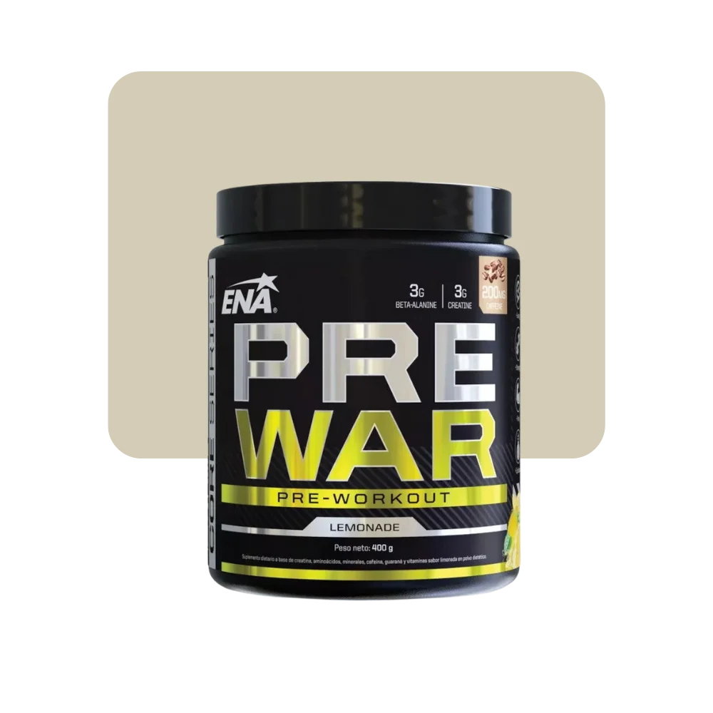 PRE WAR es la siguiente evolución en pre entrenamientos. Diseñado con precisión para desafiar tus límites, favorece la concentración, el aumento de energía, la fuerza, el tamaño muscular y la recuperación. Fórmula mejorada con 200mg de cafeína por ingesta.