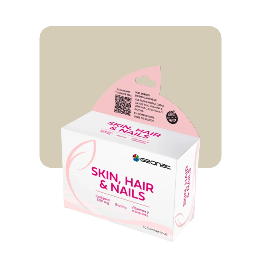 Skin Hair & Nails es un suplemento dietario en comprimidos, libre de gluten, formulado a base de colágeno hidrolizado, zinc, calcio, vitamina C, vitamina E, vitamina A y biotina.